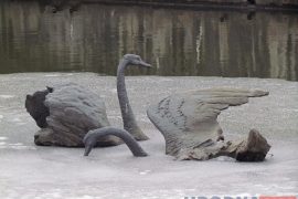 Адзін з бронзавых лебедзяў, які з’яўляецца часткай скульптурнай кампазіцыі Уладзіміра Панцялеева «Птушкі на вадзе», што ўсталявана ў зліцці ручая Юрыздыка і Гараднічанкі блізу вуліцы…