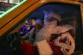 Галоўны Дзед Мароз са Снягуркай прыехалі ў Гродна на цягніку, адкуль пераселі на чырвоны спартыўны аўтамабіль. Ён узначаліў святочную калону ўпрыгожаных машын. 400 Дзядоў…