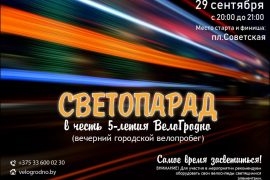 Веласіпедыстаў запрашаюць на незвычайны гарадскі велапрабег – Светлапарад. Чаму светлапарад? Таму што гарадскі велапрабег пройдзе вечарам, пасля заходу сонца, а ўдзельнікі ўпрыгожаць ровар і…
