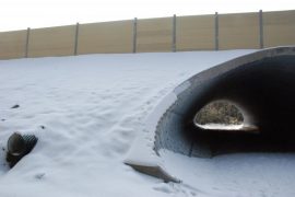 Скразная труба з гафрыраванага металу з двух бакоў выводзіць прама ў лясныя зараснікі, магістраль ідзе паверсе. Пазнаць пераход можна па шумападаўляльных панэлях уздоўж насыпу.…